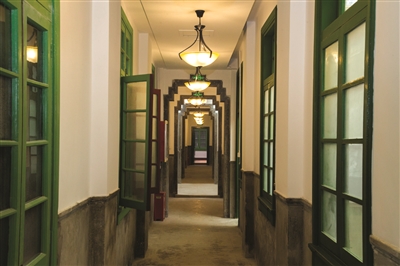 从外面看,钟楼没有明显修缮的痕迹,红色的砖墙,非常有沧桑感。学校老师特地为我们打开了钟楼的门。中间主楼是大厅,两边附属楼只有一层,都是一个个房间。钟楼的墙壁粉刷一新,内部的门窗按修旧如旧的原则,依旧是当初的绿色。走到钟楼里面,走廊里的吊灯一盏盏亮起来,红色的地板,充满岁月沧桑感的石墙,而窗外就是之江校区郁郁葱葱的树林,一缕缕金色阳光穿过树林,斜照在钟楼门前的林荫道上,这种感觉真的很奇妙。