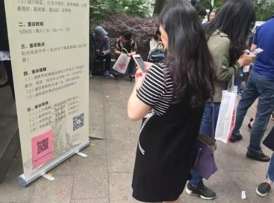 只见一个妈妈掏出手机,扫描面谈公告上的二维码,“要填孩子姓名、家长姓名、联系电话,还有毕业学校,然后在手机上直接写作文。”