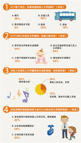在各种场合中,96%的人曾经在地铁、公交、高铁等常用交通工具上遇到大声说话的人。
