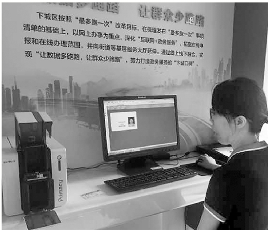 昨天下午2点,下城区长庆街道政务服务中心,柳营社区工作人员章颖正在这里给社区居民办理老年证。服务中心负责办理的工作人员何灵音业务十分熟练,不到三分钟的时间,办好的老年卡就从一台白色的机子里“吐”出来。