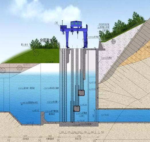孙羽说,之所以把选址点放在金竹牌,基于该地水域开阔、水质稳定优良,受周围环境影响小等因素。“为了选取最优质的原水,在千岛湖水位93.5m、85m、76.5m等处设置了3个取水工作闸门,根据水质的监测数据,择优开启闸门,确保始终取到最优质的原水。比如底部的取水工作闸门位置大约在海拔高度76米左右,相当于水深31米处。”