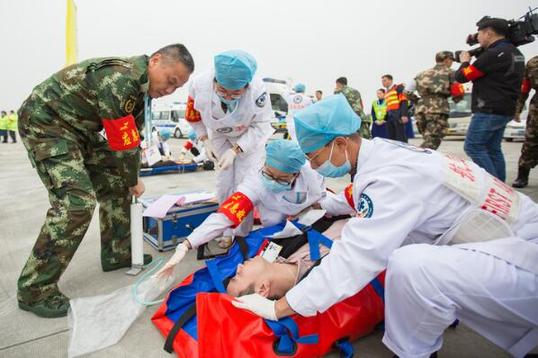 机场医疗救护力量立即登机救援,将机上全部人员转移至急救分检区。救护现场用不同颜色的旗帜分成了不同的区域:红色旗代表危重伤,必须紧急救治;黄色旗代表中伤,可稍缓救治;绿色旗代表轻伤;黑色旗代表死亡。在对伤员进行现场紧急救护后,急救车将伤员迅速转往医院进行进一步救治。