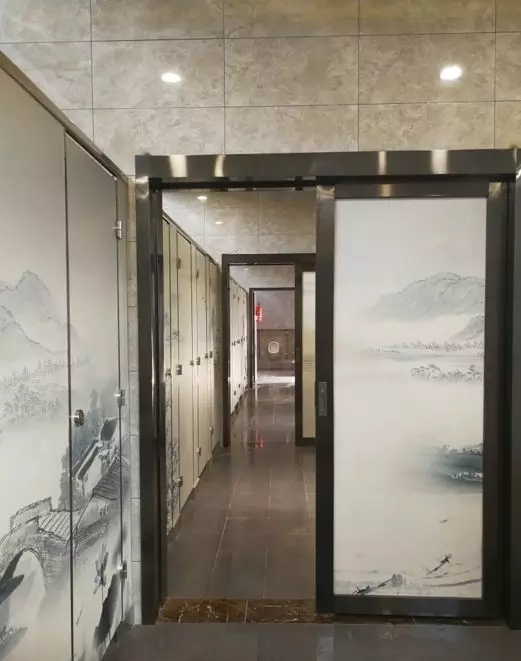 走进去一看,更让人觉得心情愉悦,因为所有的厕所门连在一起,组成了一副江南水墨风景画。