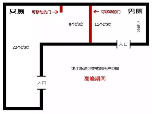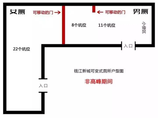而用厕高峰时段它是这样的:左侧门打开,右侧门关闭,原本夹在两扇门之间属于男厕的8个坑位,此时被划分到女厕所里,这时的女厕瞬间增加到了30个坑位。