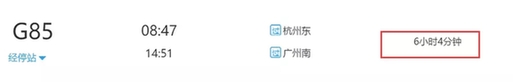目前,杭州东至广州南每天开行5趟高铁、3趟动车,最快的G85次列车,全程6小时4分钟,二等座票价720元。