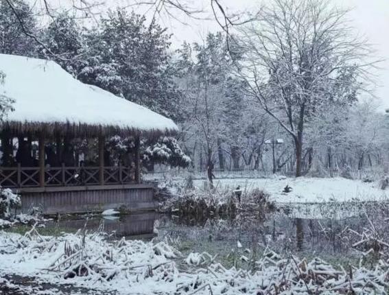 玉皇山下,八卦田边的江洋畈生态公园里,湖面结着薄薄的冰,倒映着披着白雪的树木,也是一处赏雪佳地。
