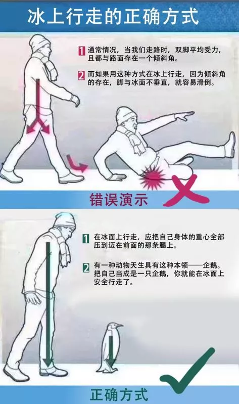 防摔小贴士走在冰雪上时应注意透明薄冰和藏在雪下的冰。学企鹅一样在冰上走路,放慢脚步,两脚分开至肩膀的宽度,摇摆的走小步,这样能把身体重心保持在前腿。另外,走路时要把手拿出口袋,用手臂保持平衡,如果跌倒,放轻松,不要用手臂来支撑。