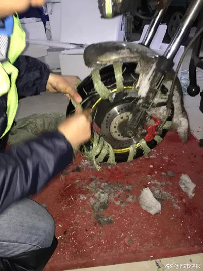 昨天网上热传一则消息,这几天杭州下雪路面湿滑,有个送快递的小哥自制防滑神器,用布条捆绑轮胎,小哥说,这样做大雪天也不耽误准时送达。