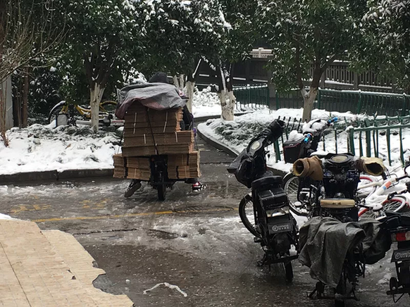 老洪拎上打包盒准备出发。我说,下雪天骑车当心啊。老洪点点头,跨上电动车座椅,“平时三四十码肯定有的,快一点才能送得多嘛,这几天老听说有人摔跤,自己摔了没事情,要是把东西洒了,那怎么办?”