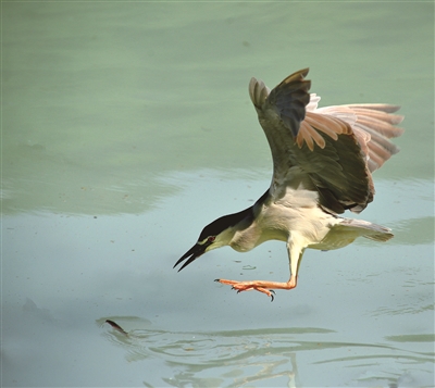 觅食的夜鹭静静地停在水边,死死盯着猎物,基本一击必中。偶尔,朱碧颖也能看到飞翔中的夜鹭一个俯冲,潇洒地从水里抓出一条倒霉的鱼儿。
