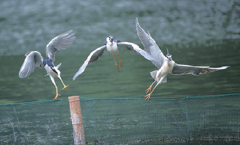 而随着气温越来越高,夜鹭们也越来越活泼好动,简直和冬天是判若两鸟。尤其现在,到了傍晚时,夜鹭有群飞的习惯,在茅家埠这几个岛,可以看到“千鹭腾空”壮观景象。不过,前提是你要能忍受难听的“鹭岛小夜曲”。