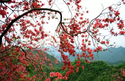 漫山遍野的杜鹃花“明火执仗”地盛开着,令人眼花绕乱,目眩神迷,绿树青山中片片火红灿若红霞,正如宋时杨万里的诗句“一路山花不负侬”。