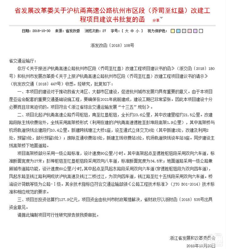 昨天,省发改委官网公示了《沪杭甬高速公路杭州市区段乔司到红垦改建工程项目建议书批复的函》,意味着沪杭甬高速公路杭州市区段抬升改造工程已经近在咫尺了。