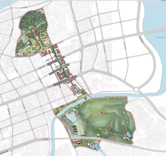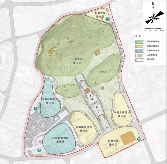 本次规划范围的划定,充分结合两处国保单位保护区划以及最新考古成果和城市建设配套的现实需求,分为太庙山区块、功臣山区块及塔山路沿线三个区块;同时依据遗产价值诠释主题、考古成果现状、上位文保规划及城市控规等规划条件,将规划近期实施范围划分为太庙山王陵展示区、功臣山吴越文化展示区及塔山路吴越文化体验带 3 大主体功能布局,并细化为 12 个小片区;其中,太庙山区块结合王陵保护区划以及区政府大院遗址考古情况分作两期规划实施。