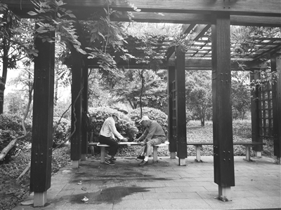 市民在亭子里切磋棋艺