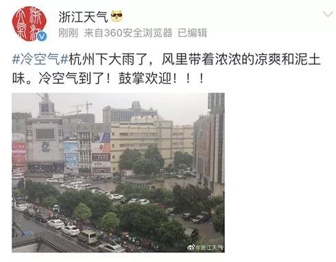 @浙江天气 说:杭州下大雨了,风里带着浓浓的凉爽和泥土味。