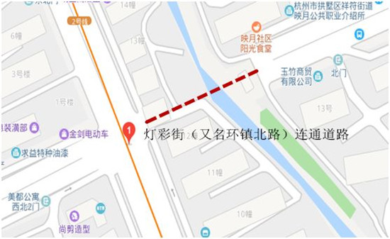 灯彩街(又名环镇北路),位于西湖区和拱墅区交界处,西起古墩路,东至镇东河以东,全长110米,宽42米,其中含16米长的跨镇东河桥梁。目前正在进行管线迁移、土地平整,开始钢箱梁加工,计划今年10月底建成通车。