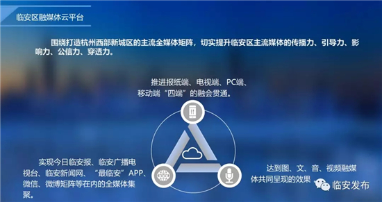 将临安区新闻传媒中心、临安区广播电视台、“临安发布”政务平台、临安区委报道组职责进行整合,组建杭州市临安区融媒体中心(杭州临安新闻传媒集团有限公司),对外保留“杭州市临安区广播电视台”牌子,建成集传统媒体、新兴媒体、社会宣传资源于一体的新型主流新闻传媒机构。