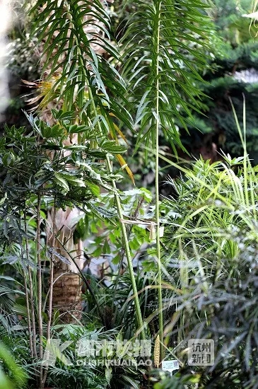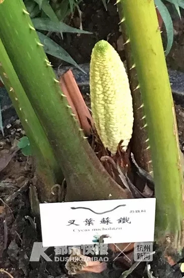 还是杭州植物园,在温室区,有一棵十几年前引种保育的一棵国家一级保护植物叉叶苏铁第一次开“花”了。