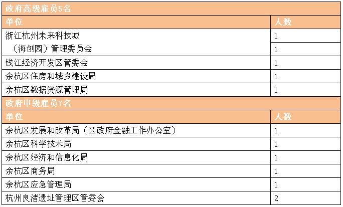 余杭区面向清华大学、北京大学毕业生招聘党政机关储备人才(以下简称“清北招聘”)、面向海外招聘政府雇员(以下简称“海外招聘”)。清北招聘党政机关储备人才40名,其中事业编制人员30名,部分岗位可自主选择事业编制或政府中级雇员身份的10名。海外招聘政府雇员共12名,其中招聘政府高级雇员5名、政府中级雇员7名。