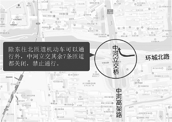 昨天,钱江晚报记者从杭州市建委(市快速路网建设领导小组办公室)和市公安局交通警察局了解到,自6月29日(周六)零时起至2020年12月31日,上塘高架与环城北路交叉口的中河立交桥北往西、北往东、西往南、南往西、东往南5条机动车匝道将进行封闭施工,加上4月20日起就已封闭的西往北、南往东2条匝道。也就是说除东往北匝道机动车可以通行外,中河立交其余7条匝道均要封闭。