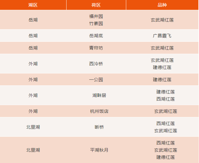 平湖秋月荷区品种主要为西湖红莲、建德红莲。
