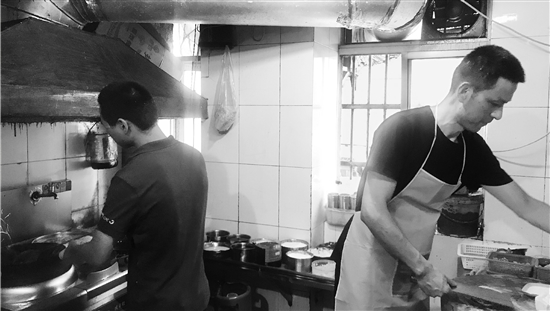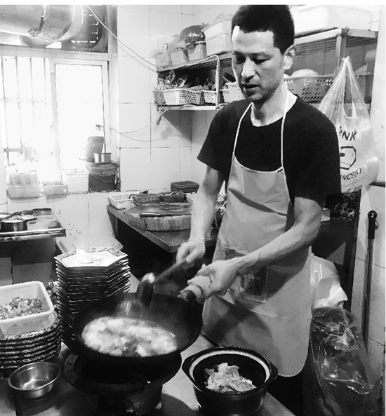 稍微空一点了,王强从厨房里走出来。“天热,客人也少。有些人没胃口,有些人叫外卖。也好,我们不用那么忙。”阿强说。他印象深刻的一次,在厨房里待了3个多小时,炒菜炒得手都抬不起来。