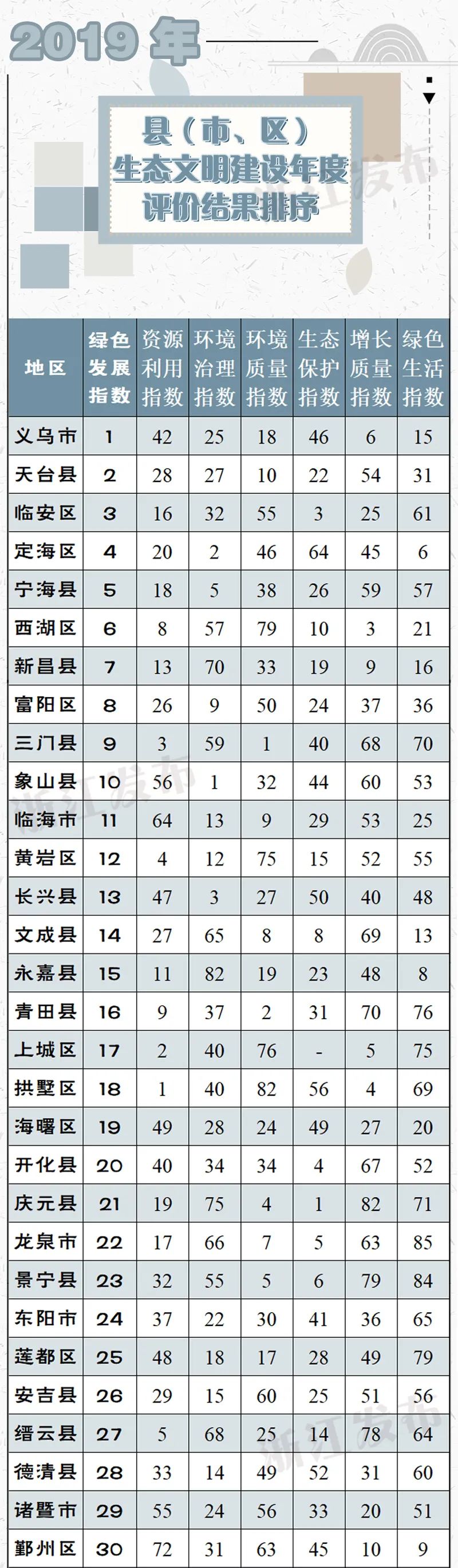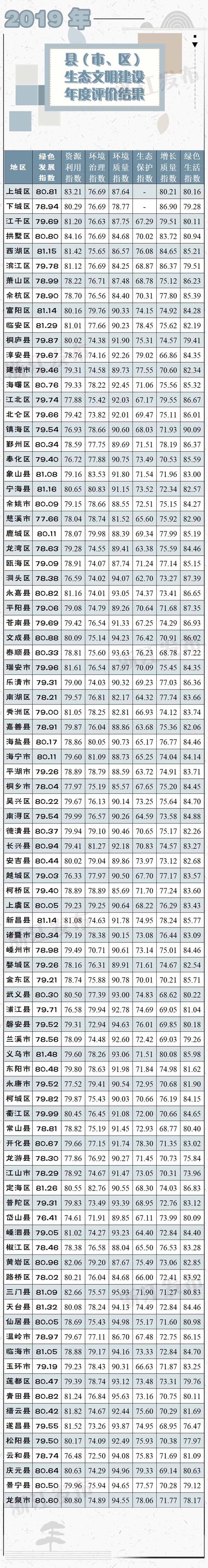 近日,浙江省统计局官网发布了《2019年我省生态文明建设年度评价结果公报》(点击查看原文),包括《2019年设区市生态文明建设年度评价结果排序》《2019年设区市生态文明建设年度评价结果》《2019年县(市、区)生态文明建设年度评价结果排序》《2019年县(市、区)生态文明建设年度评价结果》4份表格等。你家乡排名如何?速看↓↓