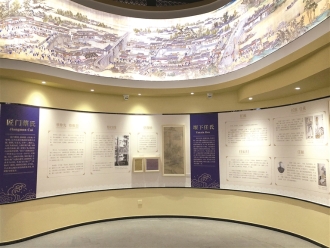 来到人文厅,“镶嵌”在展馆上方的一幅巨幅画作格外引人注目。据展示馆有关负责人介绍,“这幅画作堪称萧山版《清明上河图》,画作实为《康熙南巡图》第九卷,描绘的是康熙南巡时,从杭州出发,渡钱塘江,经萧山,抵达绍兴大禹陵的场景,而其中正好生动展现了浙东运河沿途的风貌。”
