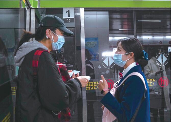 在地铁1号线火车东站站,一批统一着装、背包向前的站务小哥哥小姐姐,拿着印有“先下后上,排队候车”的定制礼物,劝导背着双肩包的乘客将背包放置胸前,并对配合的旅客送上一份小礼物。