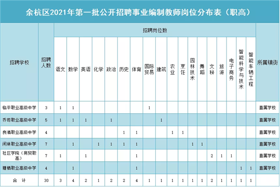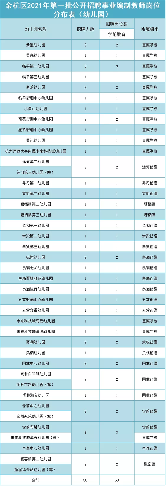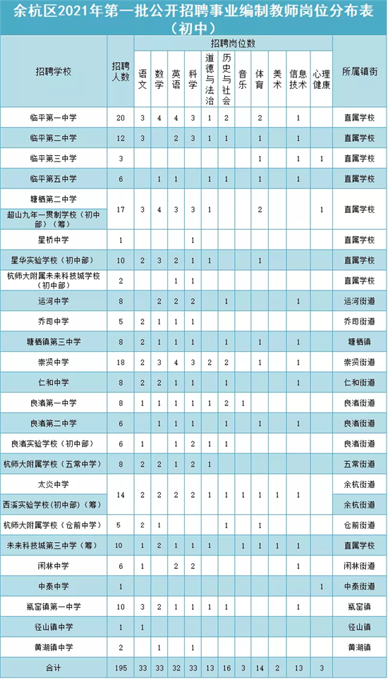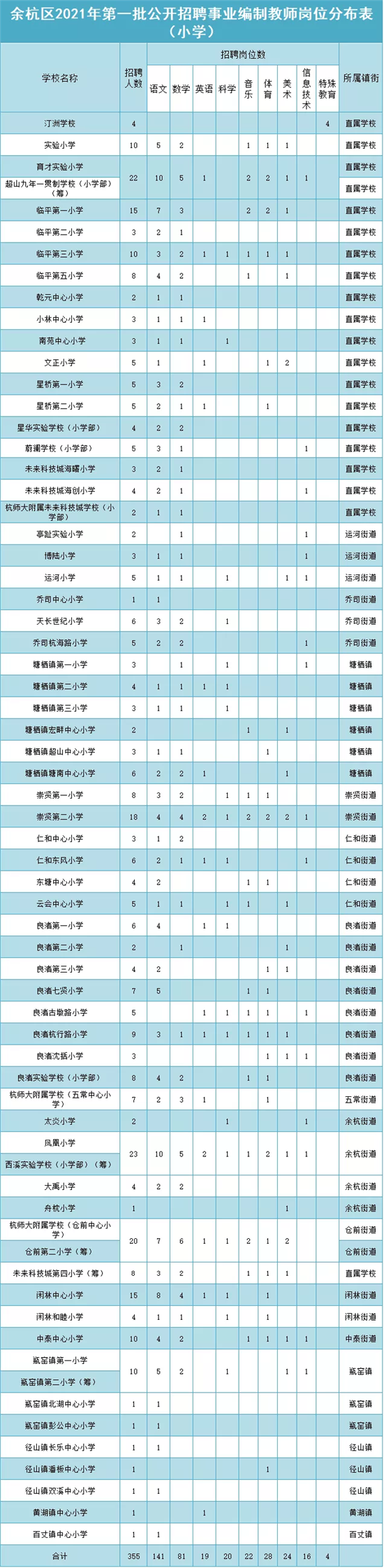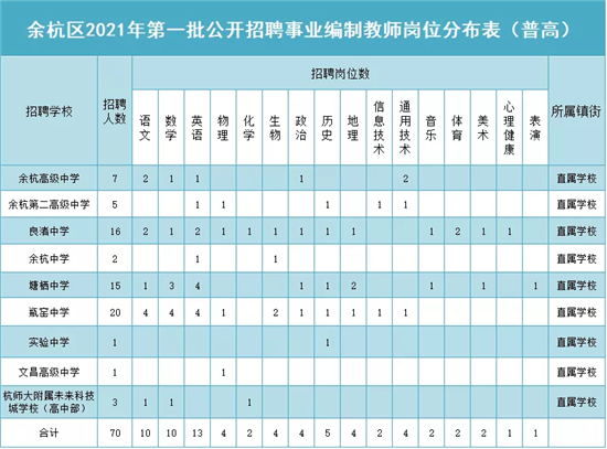 杭州市余杭区2021年第一批公开招聘中小学、幼儿园事业编制教师共700人,其中普高70人,职高30人,初中195人,小学355人,幼儿园50人。