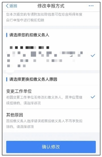 需要注意的是,如果纳税人在2020年度变更过工作单位,即扣缴义务人发生了变更,那就不能直接点击“一键带入”进行快捷填报,而要进入App首页的“专项附加扣除信息查询”,逐一对2020年度各项专项附加扣除信息的申报方式进行修改,选择最新的工作单位(扣缴义务人),并勾选变更原因。全部修改完成后,再点击“一键带入”进行确认。