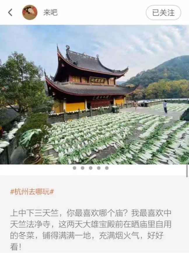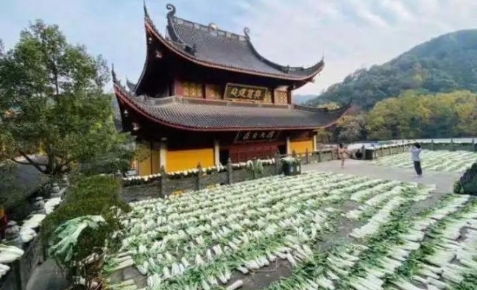 除了腌肉,还有晒白菜。快抱App的杭友圈里,网友“来吧”发帖爆料说,这两天,中天竺法净寺的大雄宝殿前,铺了满满一地白菜,充满了烟火气。一组照片引来无数人围观,并纷纷留言,“这也太好玩了,好接地气呀!”