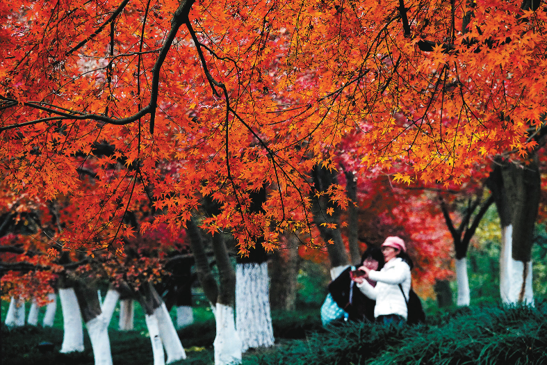 初冬时节,桐君山中枫林尽染。沿着点缀零星落叶的小道拾级而上,入眼处除了深深浅浅的绿色、金黄,还有那片片殷红的枫叶,与白色的桐君塔、湛蓝的天空交相辉映,给清冷的冬季增添几分灵动和热情。