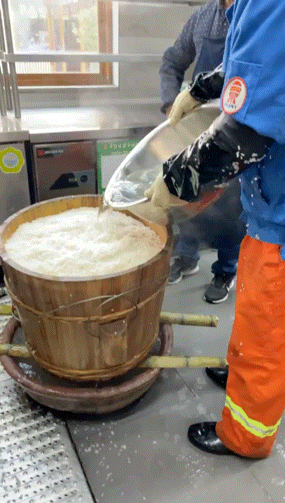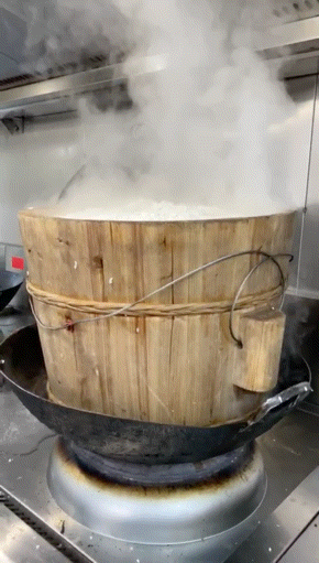 就在南山人家宽敞的院子里摆开阵势,洗干净的糯米要先泡上一天一夜,每一颗糯米都泡到饱满,再倒进一个大木桶,加水后抬上炉子蒸;蒸到半熟,抬下炉灶快速加冷水降温,同时将木桶里的水分沥干。