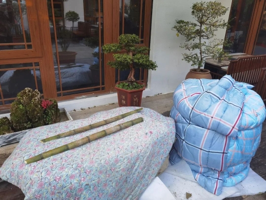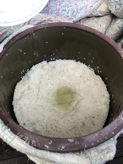 事先准备好大缸,外面还要先包上厚厚的棉被,把糯米倒进大缸,加入酒曲,仔仔细细地搅拌均匀后就盖上盖子,包好棉被。接下来的三天就是自然发酵的过程了,其间这个大缸的盖子是绝对不能打开的,我看着那自带喜感的棉被,就问怎么知道几时要加水了呢?