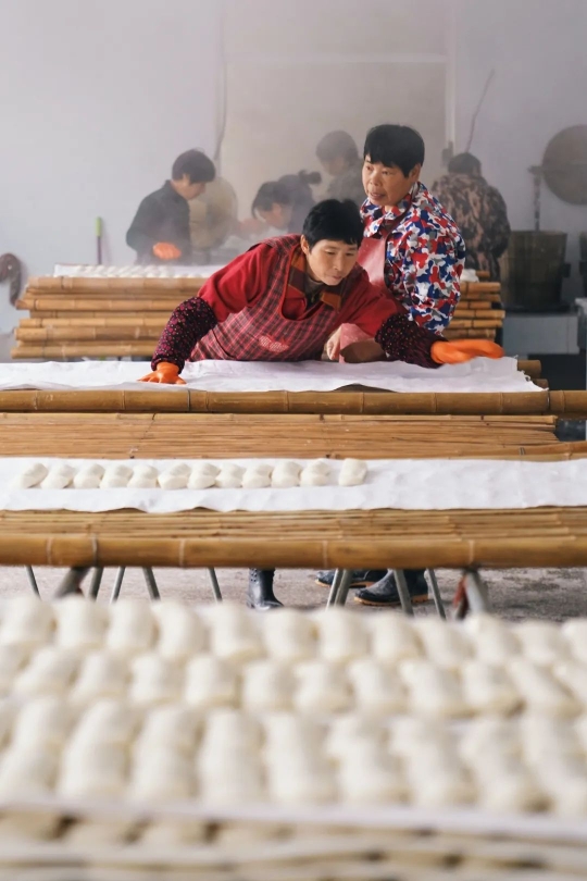 鸬鸟镇上有好几家年糕作坊,章小花的小土年糕坊现在12个人,工作日产量大约5000斤,周末7000斤,最靠近冬至的这两三天,每天要做10000多斤。对他们来说,这样的忙碌一直要维持到春节前。