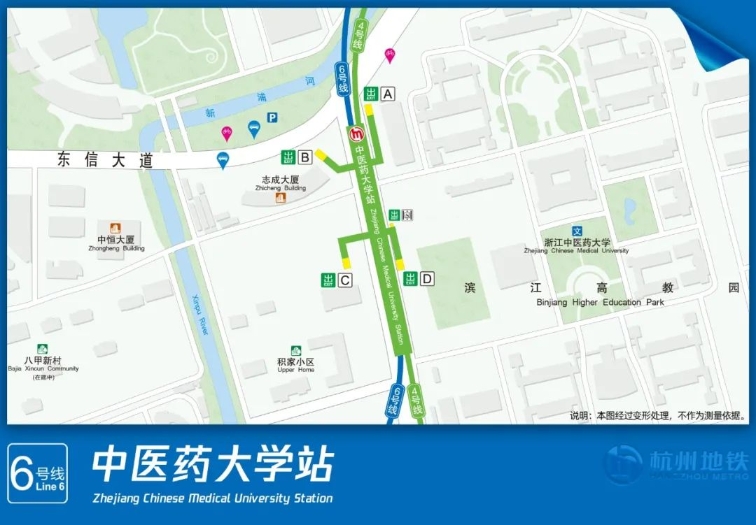 中医药大学站位于浦沿路和东信大道交叉口,是6号线与4号线的换乘站。