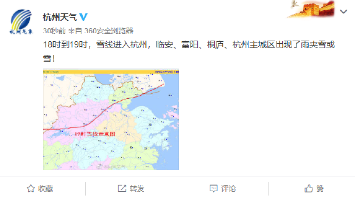 杭州气象台说,杭州主城区主要的降雪时段为20时到02时之间。由于冷空气来势凶猛,暖湿气流极速减弱退去,预计杭州主城区降雪量有限,加上地面温度较高,有可能看不到积雪,不过在山区有中到大雪。