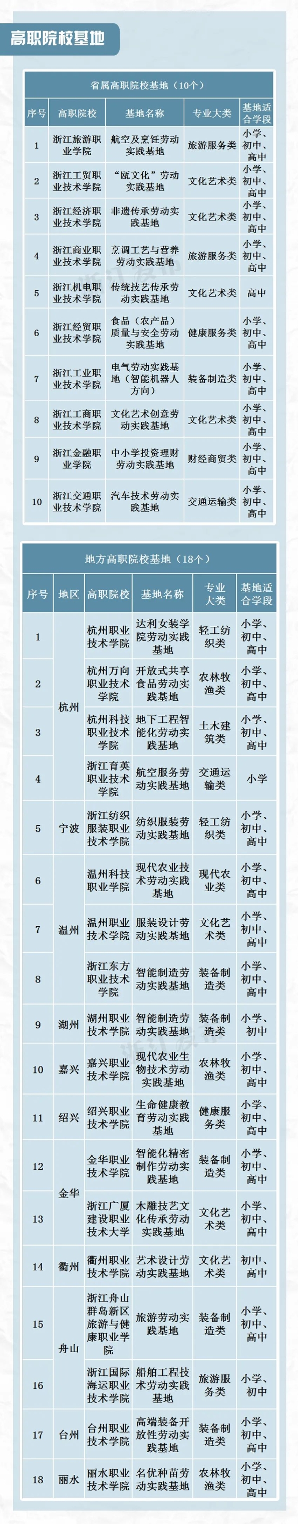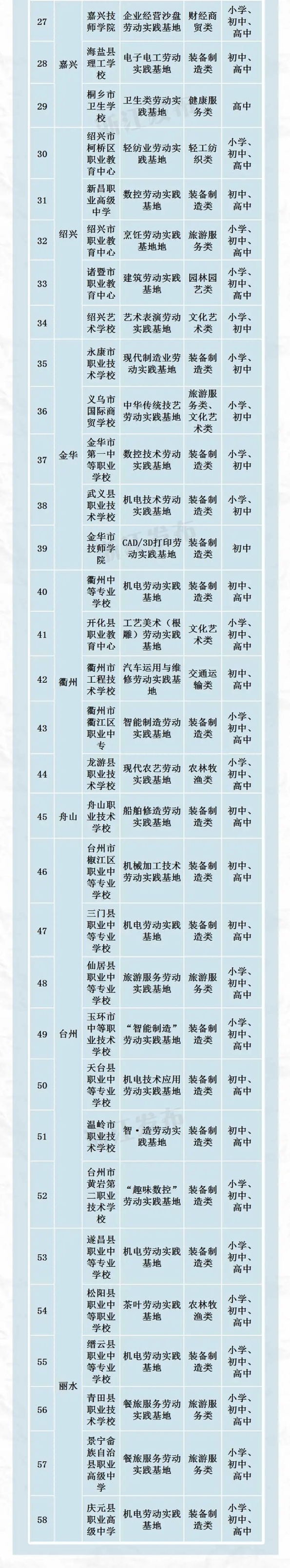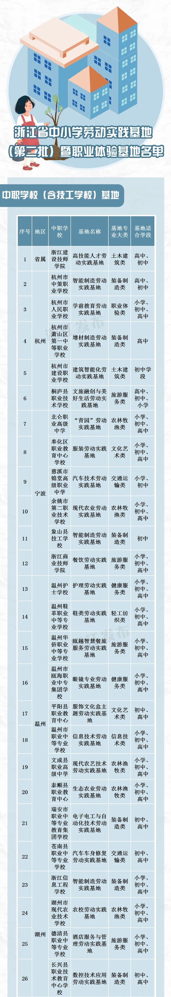 浙江发布消息 近日,省教育厅公布了浙江省中小学劳动实践基地(第二批)暨职业体验基地名单,浙江中职学校(含技工学校)的58个省级及以上实训基地或省级职业教育开放实训中心、高职院校的28个省级及以上示范性实训基地被认定为浙江省中小学劳动实践基地(第二批)暨职业体验基地。