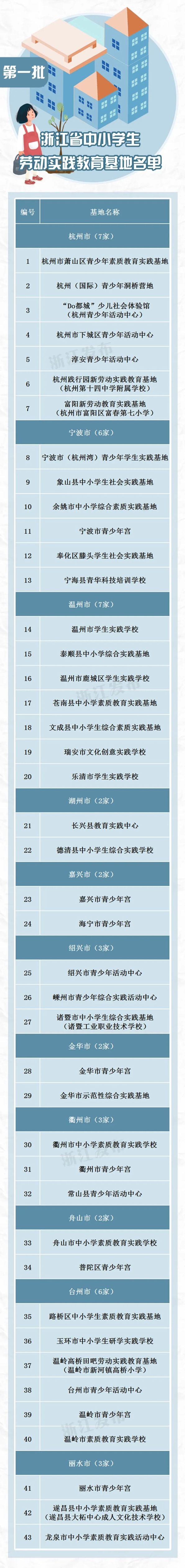 此前,省教育厅办公室已公布了第一批浙江省中小学生劳动实践教育基地名单,共43家。
