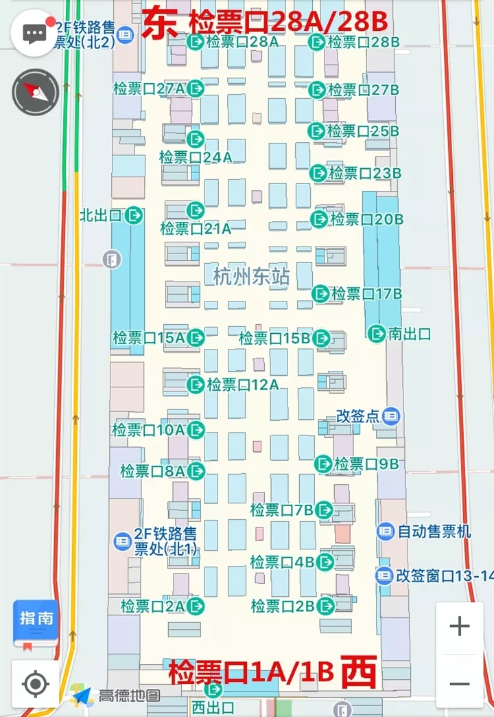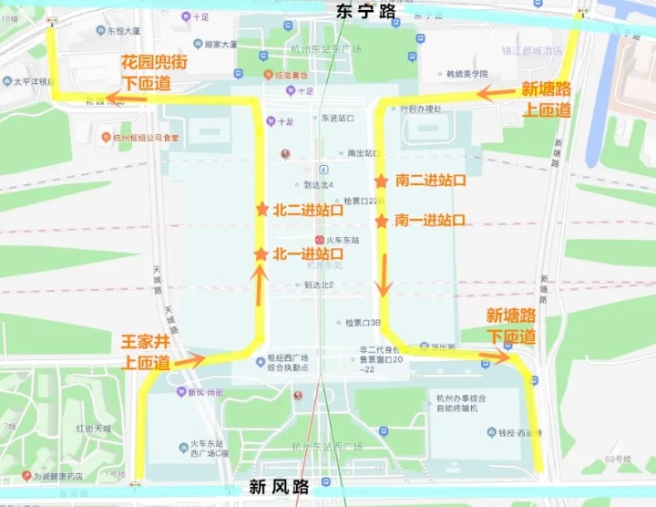 如果你是送人,杭州主城区西面天城路、新风路过来的朋友,可以从王家井上匝道上二层平台,可导航至杭州东站北一、北二进站口。