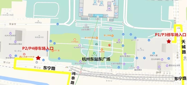 东站有很多停车场供大家选择:东面有P1—P4停车场,西面有P5、P6及P西停车场。