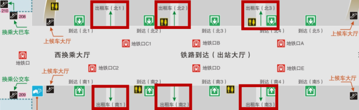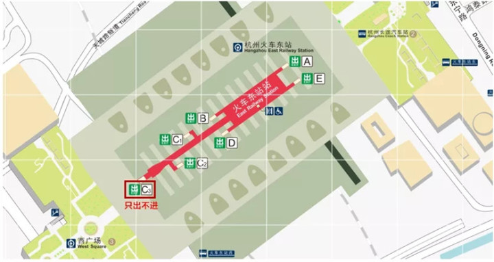 A、B、D、E出口靠近东广场,C1、C2、C3出口靠近西广场。其中,C3因高铁至地铁免检换乘原因,只出不进。