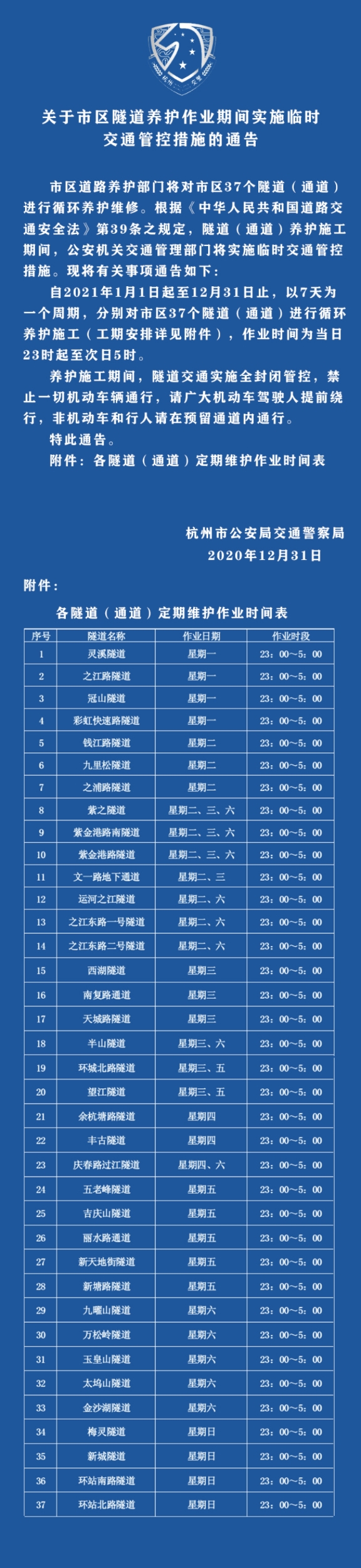 都市快报讯 2020年12月31日,杭州市公交局交通警察局发布了《关于市区隧道养护作业期间实施临时交通管控措施的通告》。