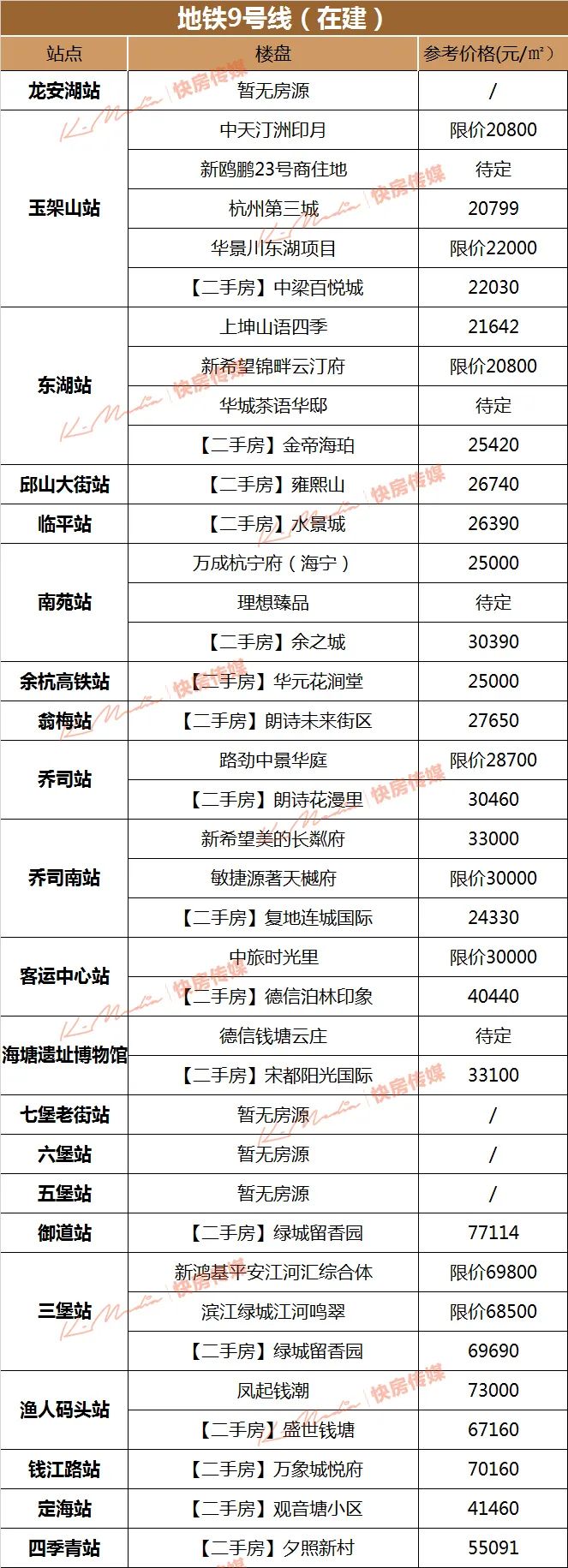 9号线一期北段龙安湖站(工程名昌达路站)到临平站,一共四个新站,邱山大街-东湖站-玉架山站-龙安湖站。9号线一期北段沿线新房房价目前都是2字头,如杭州第三城、中天汀州印月、新希望锦畔云汀府、华景川东湖项目等,作为刚需门槛楼盘,可以关注。