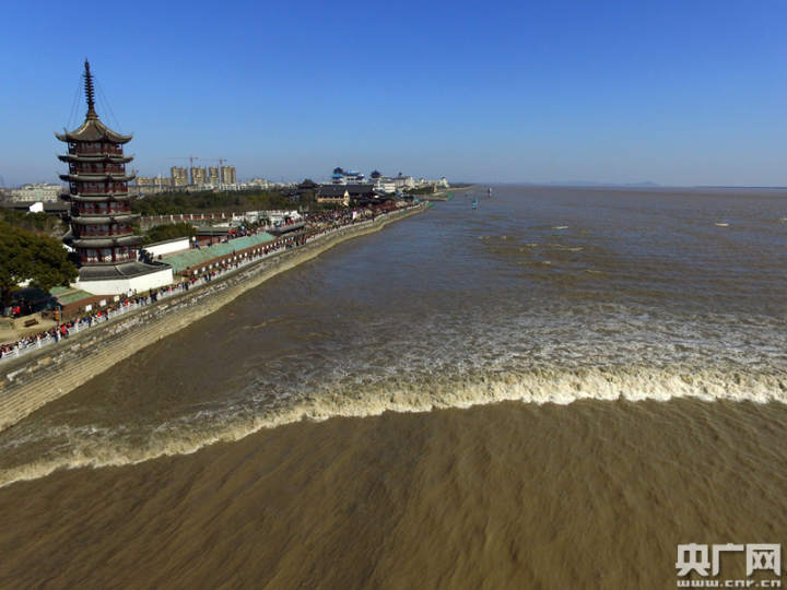 资料图:钱江潮水从浙江海宁盐官古镇占鳌塔下流过(央广网记者 魏炜 摄)