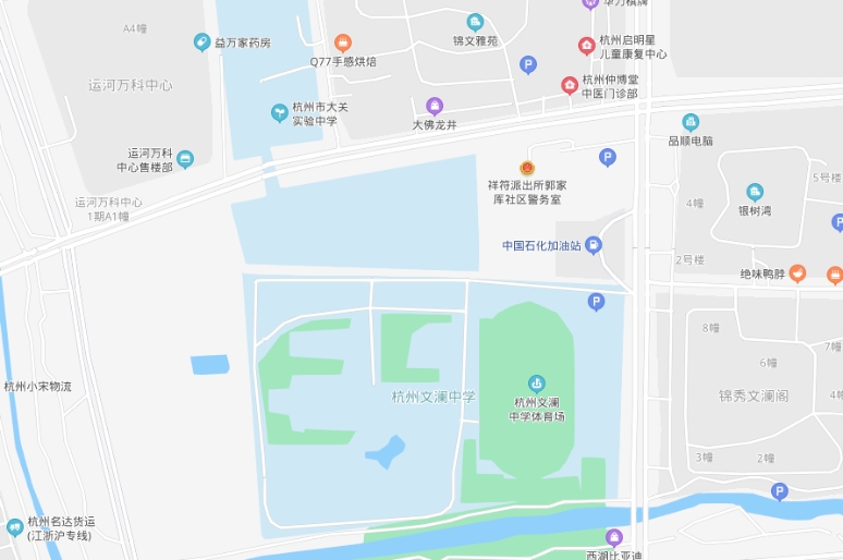 在地图上可以看到,原文澜中学地址通益路301号,它北面相邻的是通益路307号中国石化加油站,所以公告上的新址通益路303号对应的也就是原文澜中学范围内。