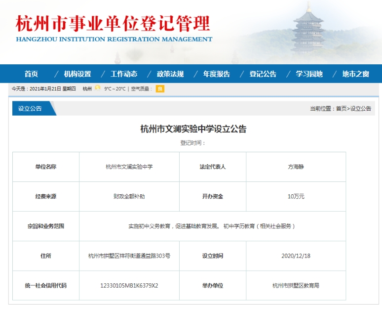 快房网消息,2021年刚开年,关于学区的重磅消息一个接一个。一张“杭州市文澜实验中学设立公告”的截图刷屏朋友圈,犹如扔下一个惊雷,一时间议论纷纷。我也就此进行了查证,在杭州事业单位登记管理网站上文澜实验中学设立的公告的确存在。