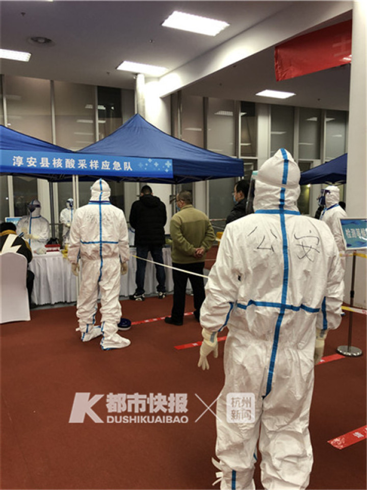 淳安县核酸采样应急队的工作人员在防护服背后都写上了所属部门。